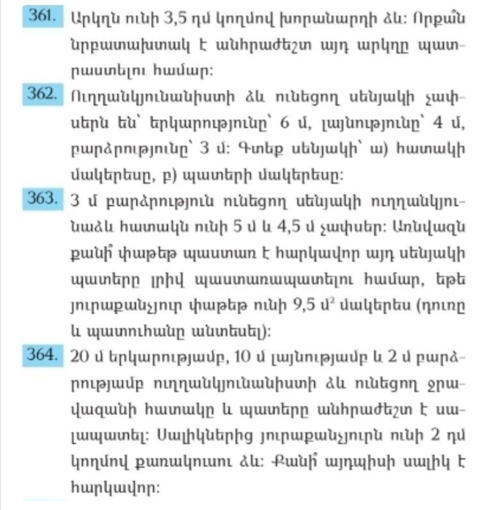 5.Գտնել 6սմ և 10սմ հիմքերով և 8սմ բարձրությամբ սեղանի մակերեսը։(6սմ × 10սմ × 8սմ) / 2 = 240 սմ²